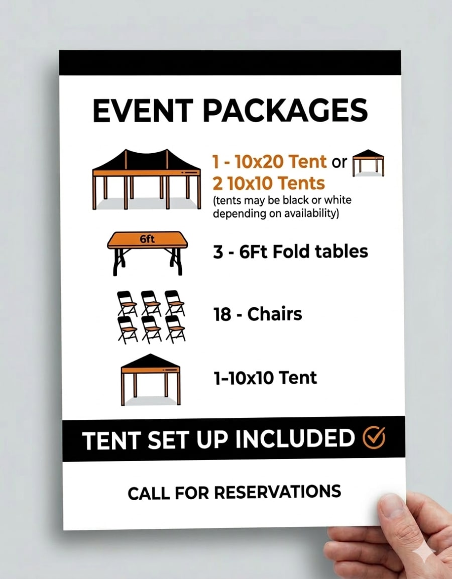 Tent Set up included. Tables and chairs are dropped off in front. *refer to FAQ